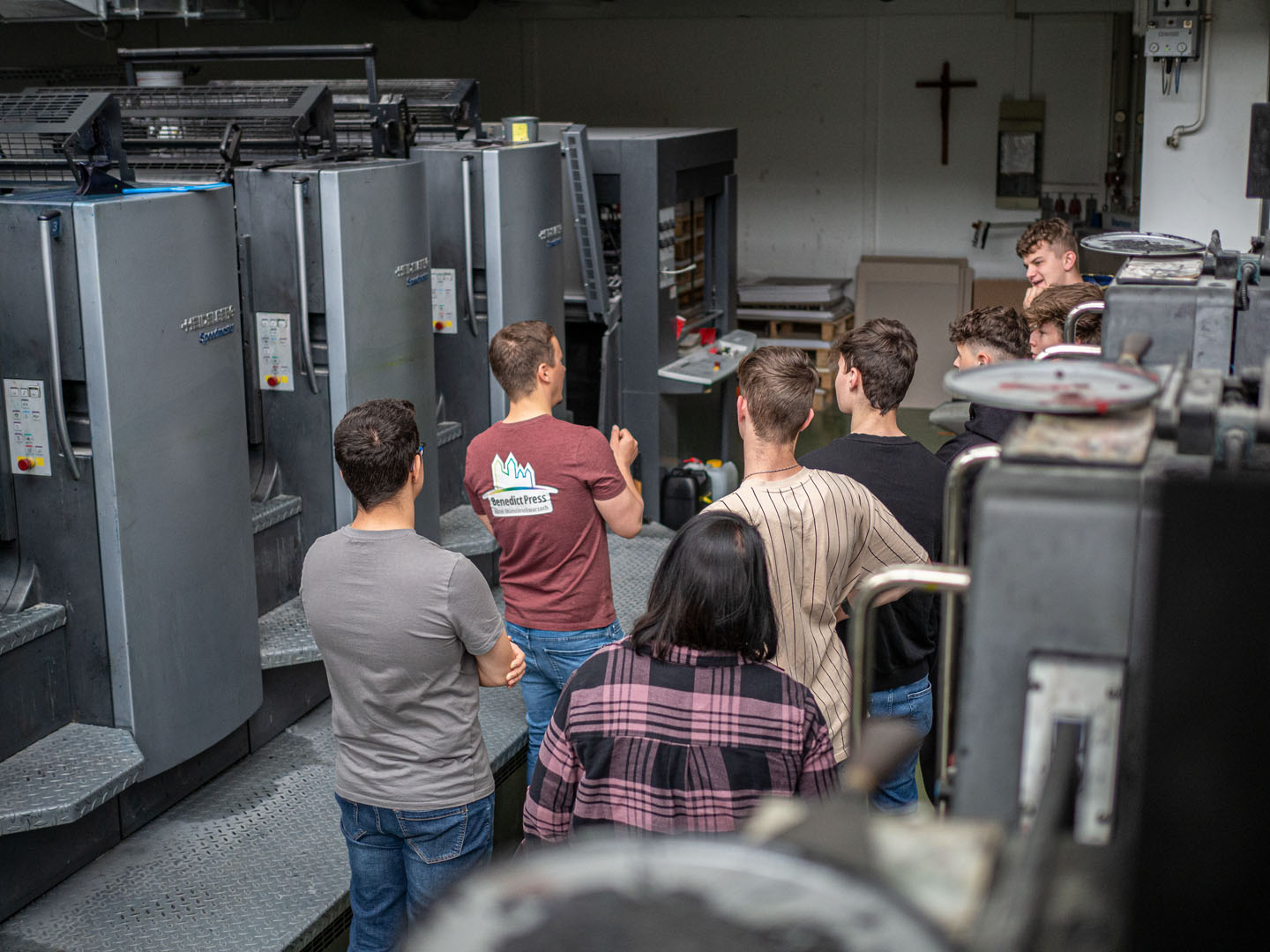 Scholz zeigte den Schülern auch auf, welche Ausbildungsberufe in der Druckerei der Mönche von Münsterschwarzach erlernt werden können: Neben dem technischen Bereich des Drucks gibt es da zum Beispiel auch noch die Ausbildung zum Mediengestalter. Die Schüler konnten sich davon überzeugen, dass die beiden Druckmaschinen aus den Jahren 1988 und 2006 dank guter Pflege und Wartung immer noch herausragende Qualität erzeugen, die gerade bei Kunstdrucken und Katalogen für Kunstausstellungen gefragt ist. Und René Scholz ist sich sicher, dass gute Druckerzeugnisse auch in Zukunft gefragt sein werden, denn: „Beim Lesen mit dem E-Book-Reader tun mir irgendwann die Augen weh“, so Scholz.