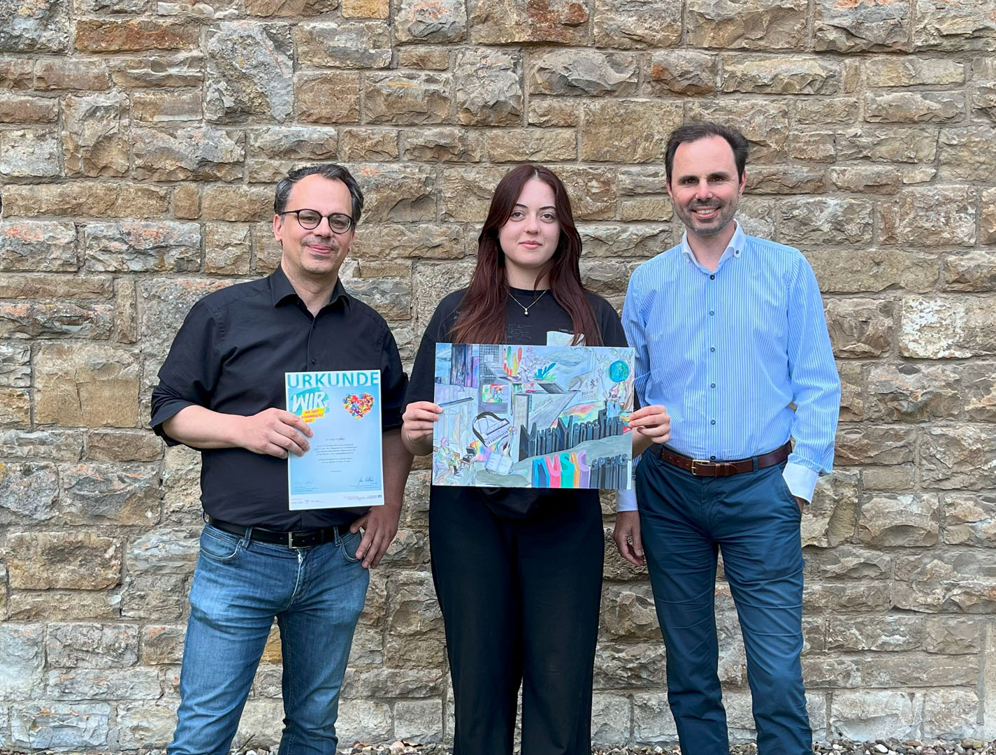 Amelie Pfeiffer zeigt das Gemälde, das einen Sonderpreis auf Bundesebene erhielt. Eingerahmt wird sie von Kunsterzieher Matthias Held und Schulleiter Markus Binzenhöfer. Foto Katrin Hübner