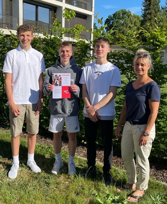 Bildunterschrift: Eine Wertsteigerung von über sechs Prozent in nur vier Monaten – das kann sich sehen lassen. Über die Auszeichnung beim Planspiel „Börse“ freuen sich Jakob Hebenstreit, Toni Reinhardt, Mica Schömig und Heike Schmiedl-Neumann, Lehrerin für Wirtschaft und Recht am EGM.