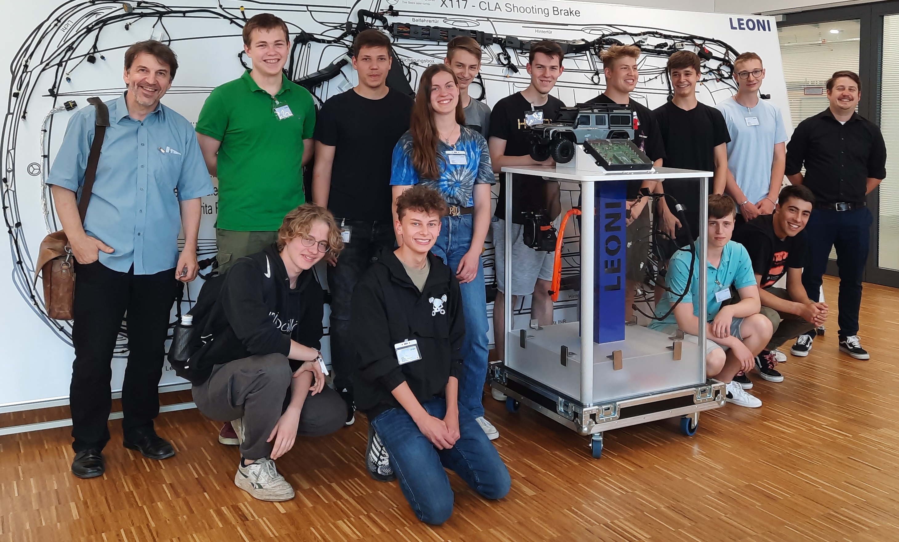Fasziniert von der Fahrzeugtechnik: Unser Bild zeigt (stehend von links nach rechts) Elmar Schrauth (Lehrer am EGM, Seminarleitung); Bonifatius Twickel, Seraphina Gegner, Philipp Eckoff, Moritz Gunsch, Malte Hempe, Erik Petersilka, Benedikt Schernau und Stefan Kirchner (Firma Leoni) sowie (knieend von links) Raphael Zeiher, Andreas Kraiß, Fabio Dietl, Max Wittstatt (Schüler am EGM).