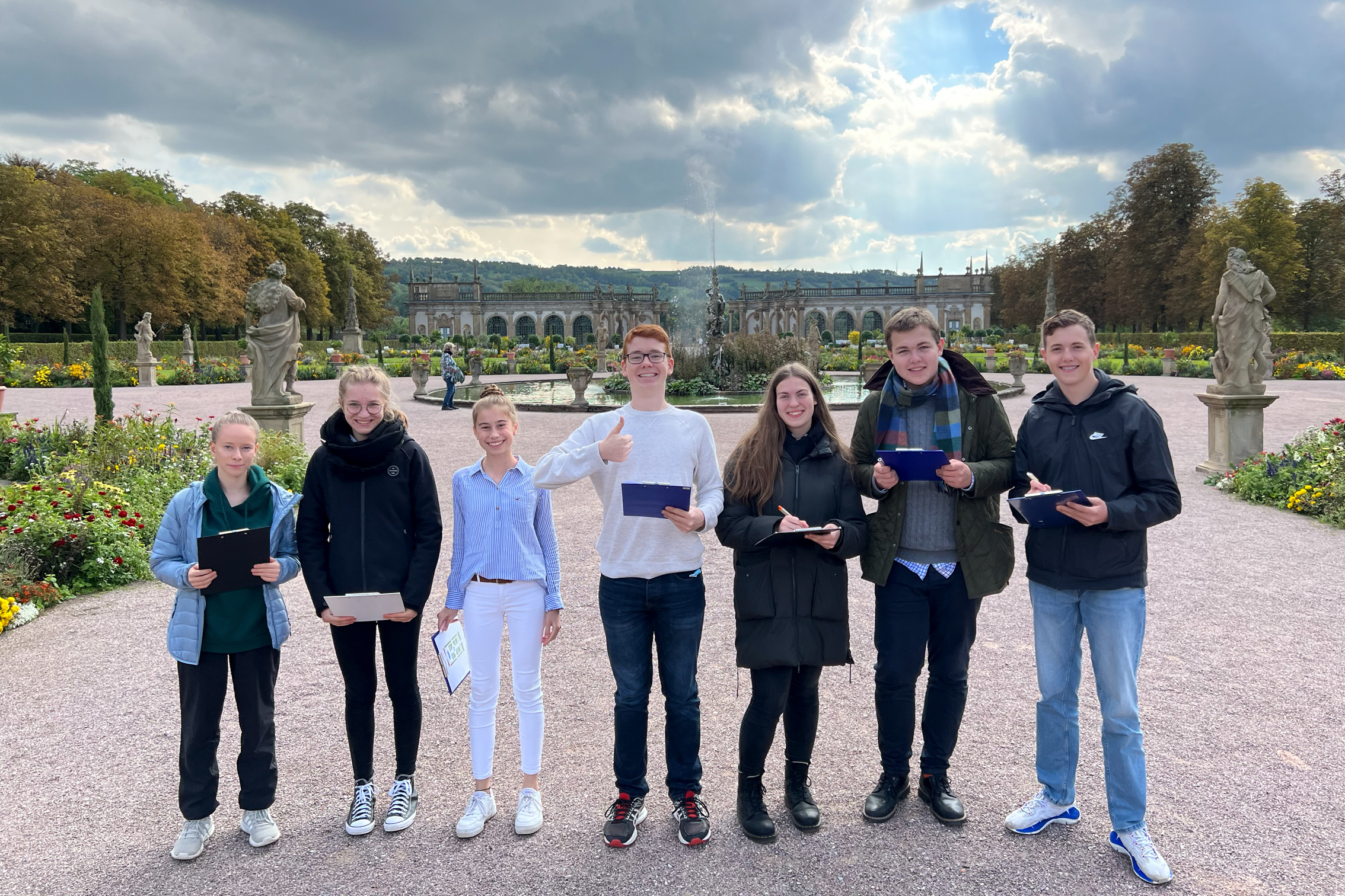 Zum Foto: Sie entschlüsselten den Barock-Garten von Schloss Weikersheim: (von links) Clara Göllner, Mia Weigand, Charlotte Seystahl (alle 9a), Maximilian König (Q11), Seraphina Gegner (Q12), Bonifatius Twickel (Q12) und Lucas Rath (Q11).