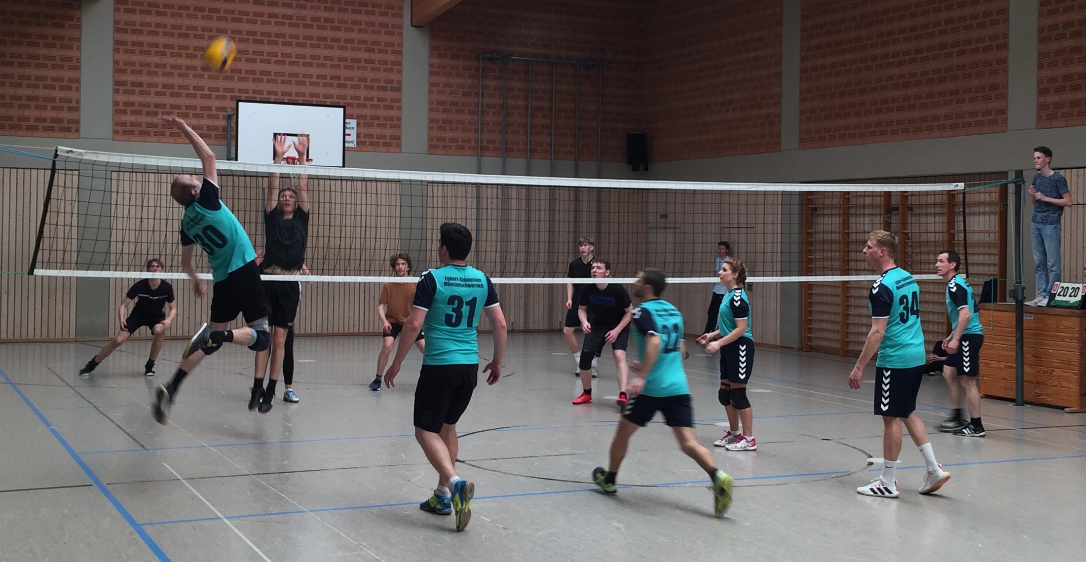 Michael Schwanfelder, im „normalen“ Schulleben Lehrer für Biologie und Chemie, schmettert den Ball gekonnt am Block der Q12-Mannschaft vorbei. Foto: Br. Jeremia