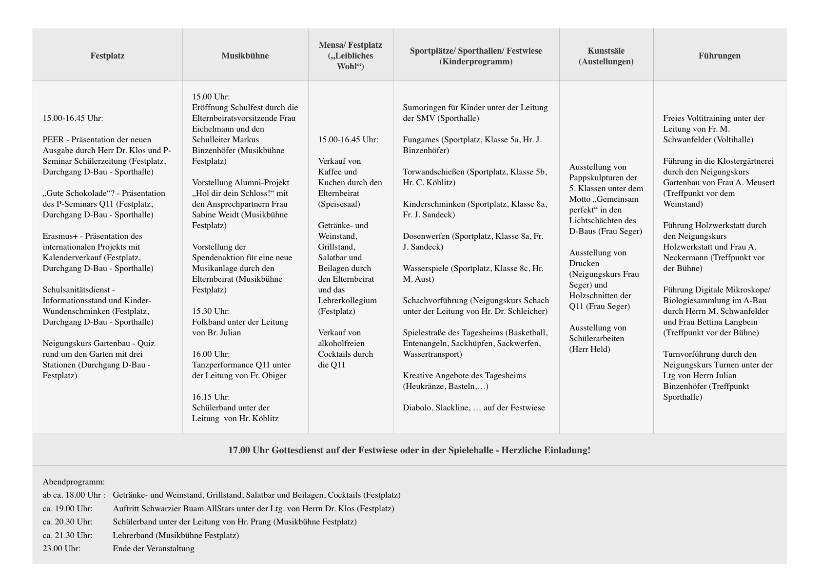 Um 17:00 Uhr findet unser gemeinsamer Schulfestgottesdienst statt. Anschließend freuen wir uns auf ein gemütliches Beisammensein mit Musik und Tanz. Für das leibliche Wohl ist selbstverständlich bestens gesorgt. Das Schulfest endet um 23:00 Uhr. Weitere Informationen zum Programmablauf finden Sie in Kürze an dieser Stelle.