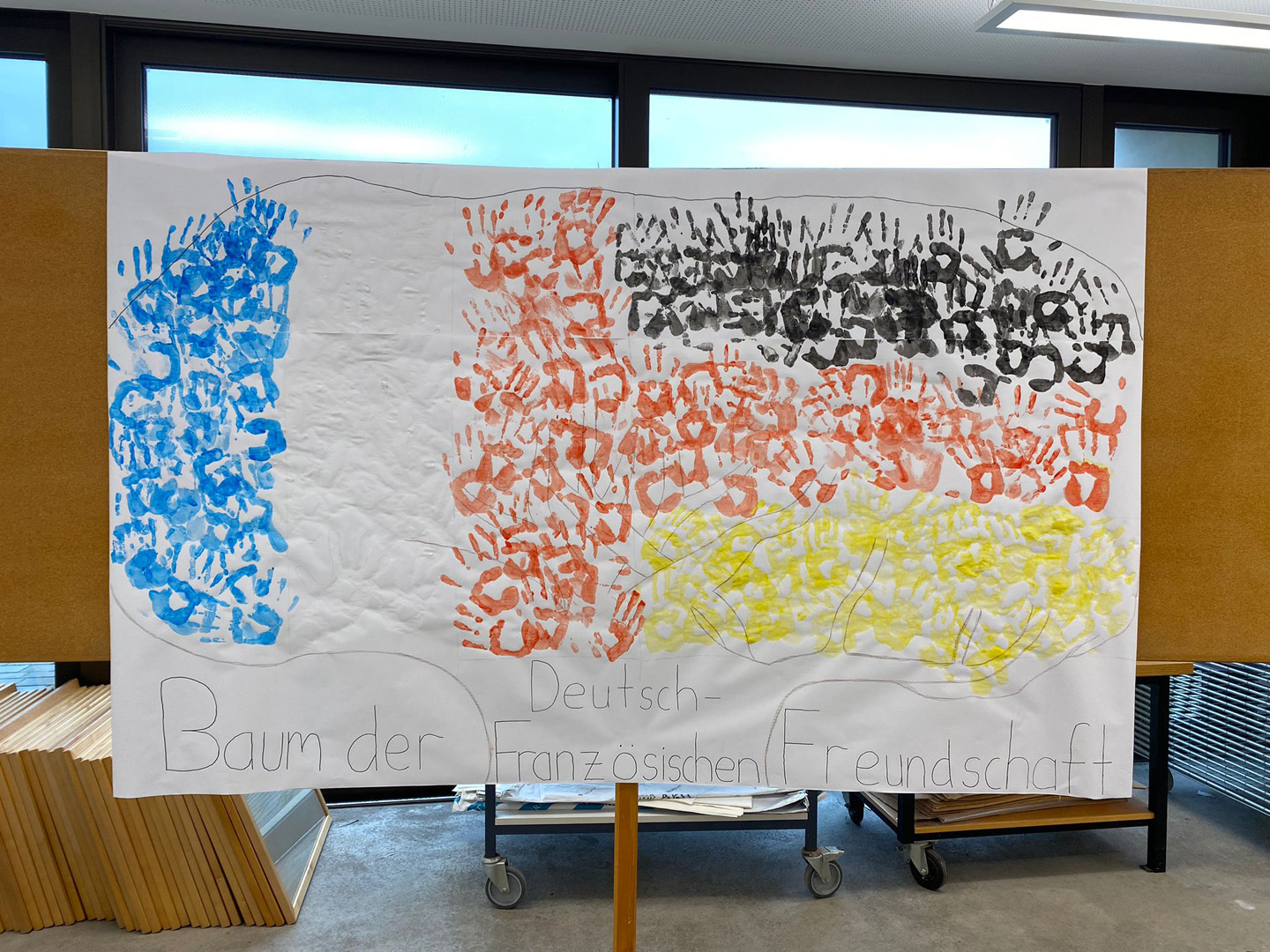 Die ganze Schulfamilie war eingeladen, einen Baum der deutsch-französischen Freundschaft mit Handabdrücken in den Länderfarben zu gestalten. Ein gelungener Vormittag, der an die Unterzeichnung des Elysée-Vertrags 1963 erinnern sowie die damit initiierten wichtigen Beziehungen beider Länder verdeutlichen soll. Vive l’amitié franco-allemande! Es lebe die deutsch-französische Freundschaft!