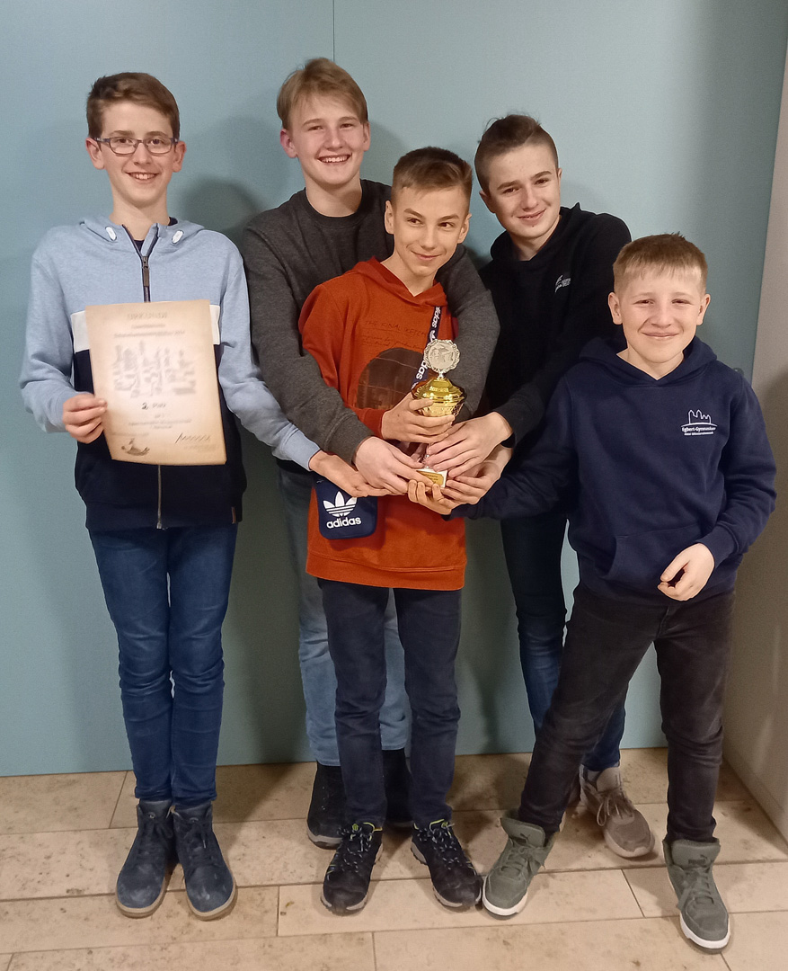 Münsterschwarzach. In diesem Jahr fand die Unterfränkische Schulschachmeisterschaft am Egbert-Gymnasium in Münsterschwarzach statt. 254 Schüler in 52 Mannschaften suchten in verschiedenen Wertungsklassen nach ihren Meistern. Dank der Hilfe vieler Freiwilliger aus der Schulfamilie sowie des Schachclubs Kitzingen, mit dem das EGM kooperiert, konnte das große Turnier reibungslos durchgeführt werden. In diesem Jahr traten drei Mannschaften des EGM an. Den größten Erfolg dabei fuhr die erste Mannschaft in der WK3 ein, die den Pokal für den 2. Platz gewann. Jonas Eckoff, Jonathan Kalb, Ben Linzert, Franz Baumann und Jannik Stöcklein mussten sich lediglich dem souveränen Sieger geschlagen geben. Die besten Einzelergebnisse erzielten dabei Franz Baumann mit 6 aus 6 und Jannik Stöcklein mit 5 aus 6. In der WK2 spielten Max Kaiser, Marvin Nixdorf (5 aus 7), David Lach, Laura-Marie Eckoff und Lenny Kneuer ein wenig unter ihren Möglichkeiten. In der WK3 startete noch eine zweite Mannschaft des EGM mit Johannes Twickel, Benjamin Sauer, Hannah Koos, Philip Haubenreich und Linus Christenn, die dabei waren, um Erfahrungen zu sammeln. Sie erzielten dabei durchaus beachtliche Einzelerfolge. Mit der Schachgruppe am EGM geht es definitiv aufwärts.