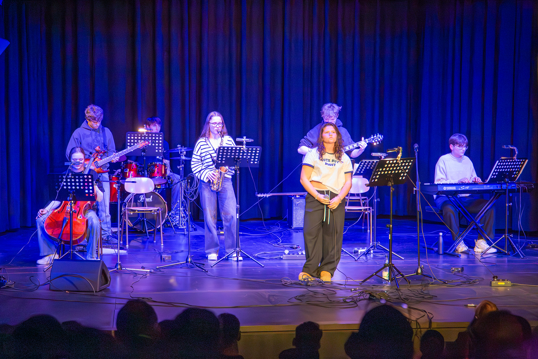 Den ersten Teil des Abends gestaltete die Schulband mit fünf abwechslungsreichen Stücken aus dem Rock- und Popbereich. Von einer gefühlvollen Metal-Ballade über Alternative Rock bis hin zu einem Soulhit spannte sich der musikalische Bogen. Die jungen Musikerinnen und Musiker überzeugten mit sichtbarer Spielfreude zeigten künstlerische Klasse durch mehrere Soloparts.