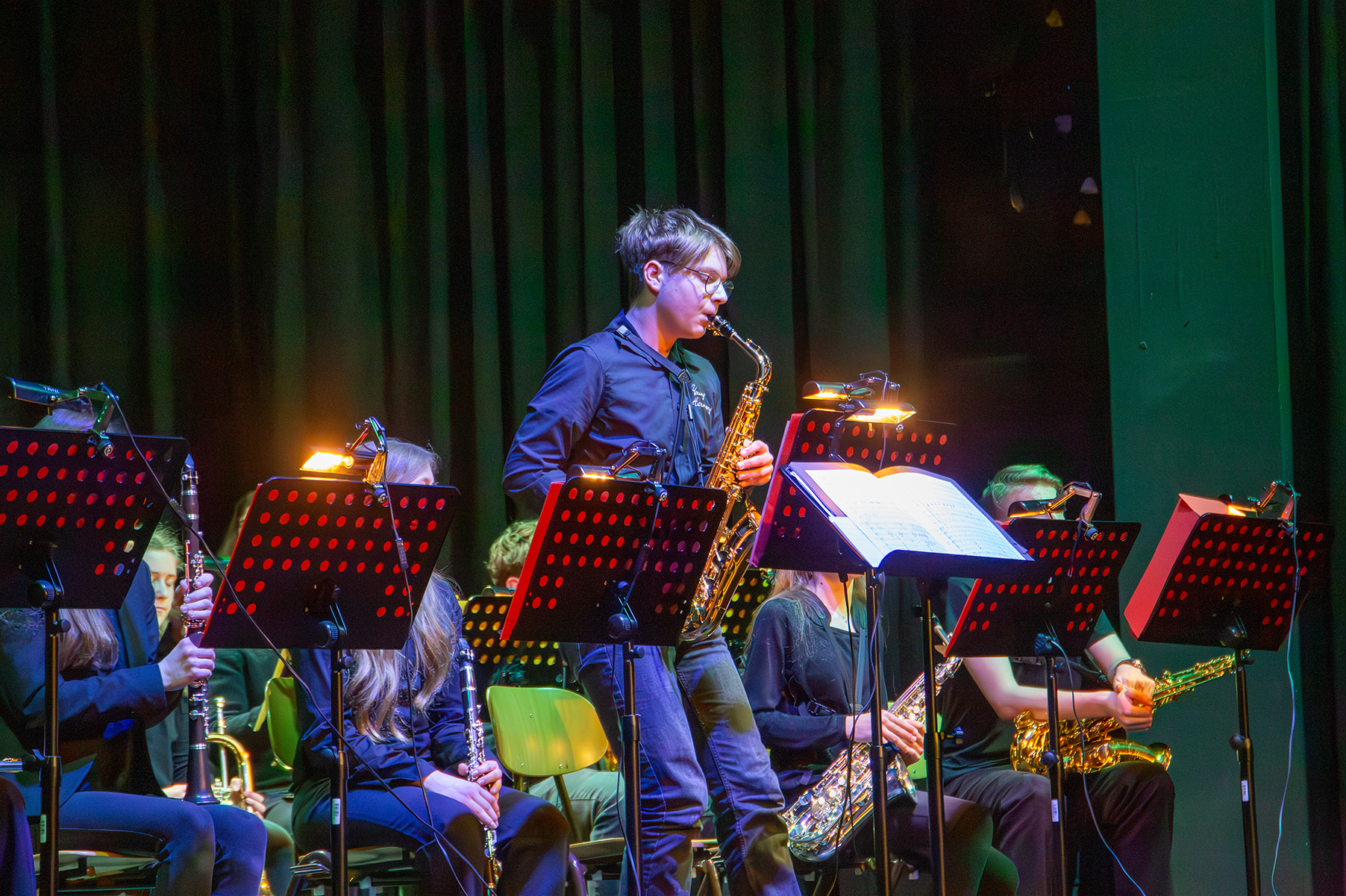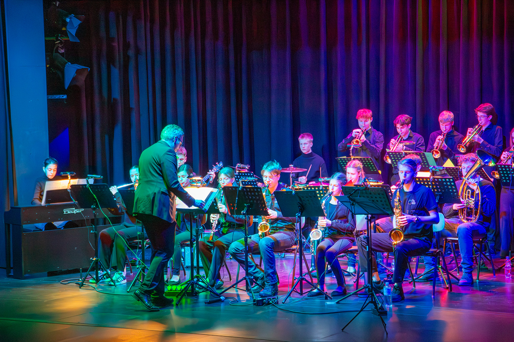 Mit der „Band Night“ hat das Egbert-Gymnasium Münsterschwarzach ein neues Konzertformat ins Leben gerufen, das ganz im Zeichen der modernen Schulmusik steht. Im Theatersaal der Schule erhielten die Ensembles Band (Leitung: Benedikt Prang) und Big Band (Leitung: Constantin Köblitz) – unterstützt durch ein Team technikbegeisterter Schüler am Lichtpult – beste Bedingungen für einen professionellen Auftritt und nutzten diese eindrucksvoll.