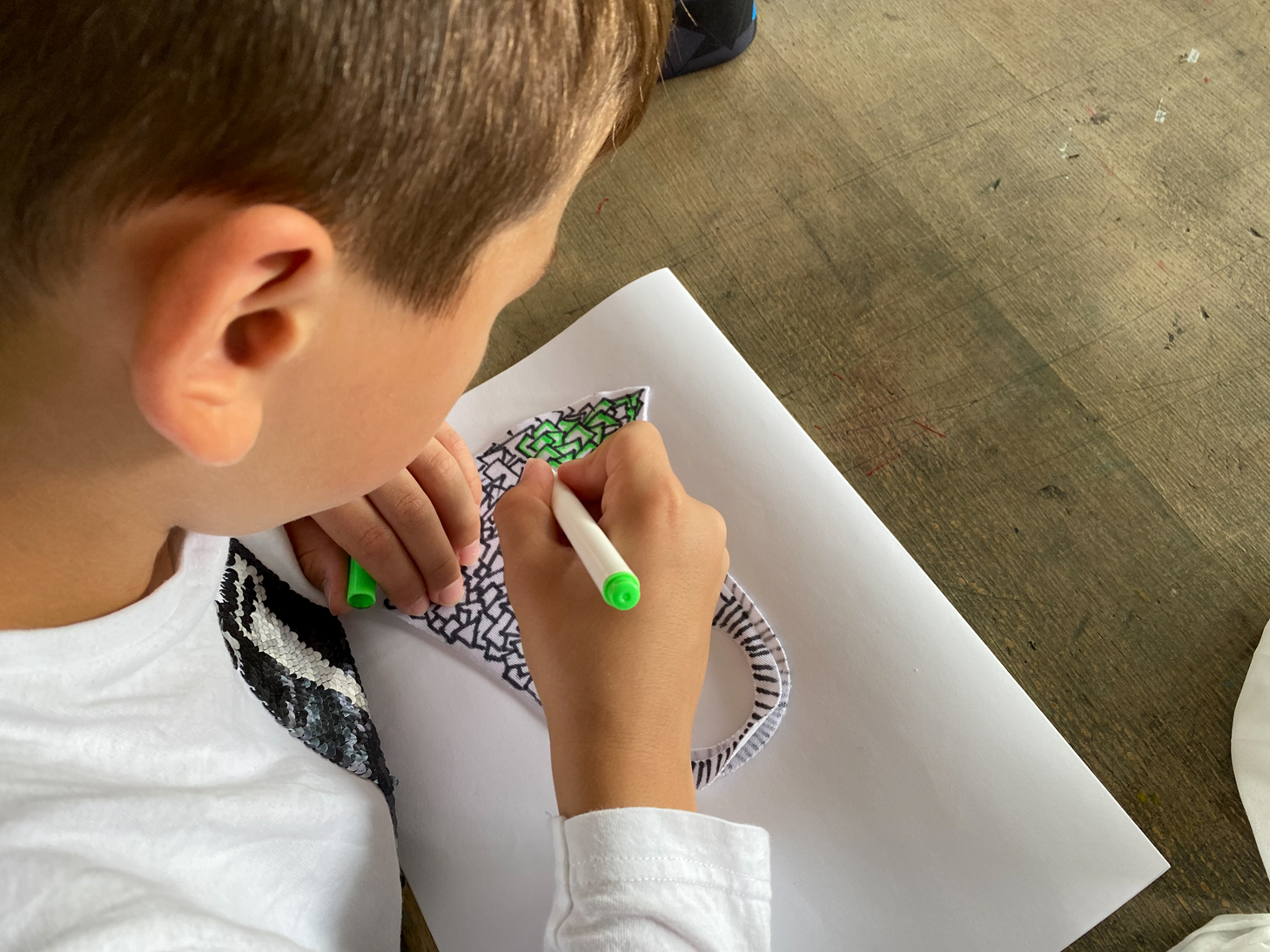 In der Kunst gestalteten die neuen Fünftklässer von der Schule gesponserte weiße Masken mit Textilmarkern.