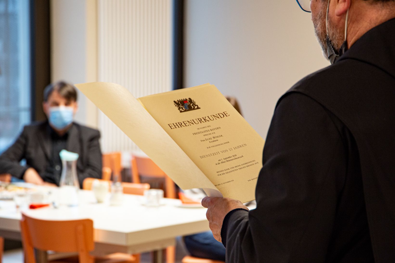 Normalerweise im Rahmen des Felizitasfestes - dieses Jahr nur im kleinen Kreis: Schulleiter Markus Binzenhöfer und Abt Michael würdigten das Engagement langjähriger Mitarbeiterinnen und Mitarbeiter.