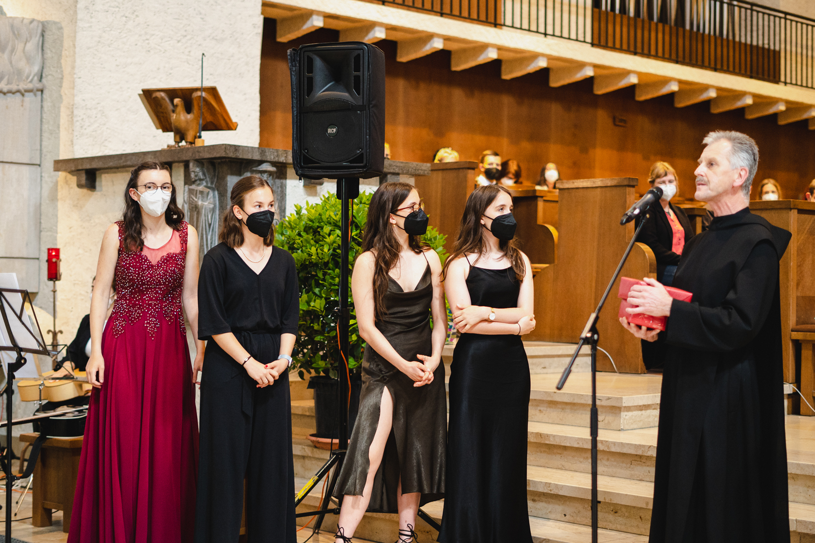 Laudator Michael Aust lobte sie als „ein Kollektiv im besten Sinne“. So kam es nicht nur zu Auftritten im Rahmen der großen Schulgottesdienste, vor allem zum Schuljahresstart und -schluss, sondern zu Engagements bei der Firmung für unsere Schüler*innen in der Abtei, bei der Konfirmation in Volkach oder bei Festgottesdiensten der DJK in Unterspiesheim im Bierzelt. Gelegentlich ergaben sich ganz andere Gelegenheiten: Ein meditativer Abend im Begleitprogramm zur World Press Photo Ausstellung in Kitzingen oder der International Knauf Award in Iphofen.