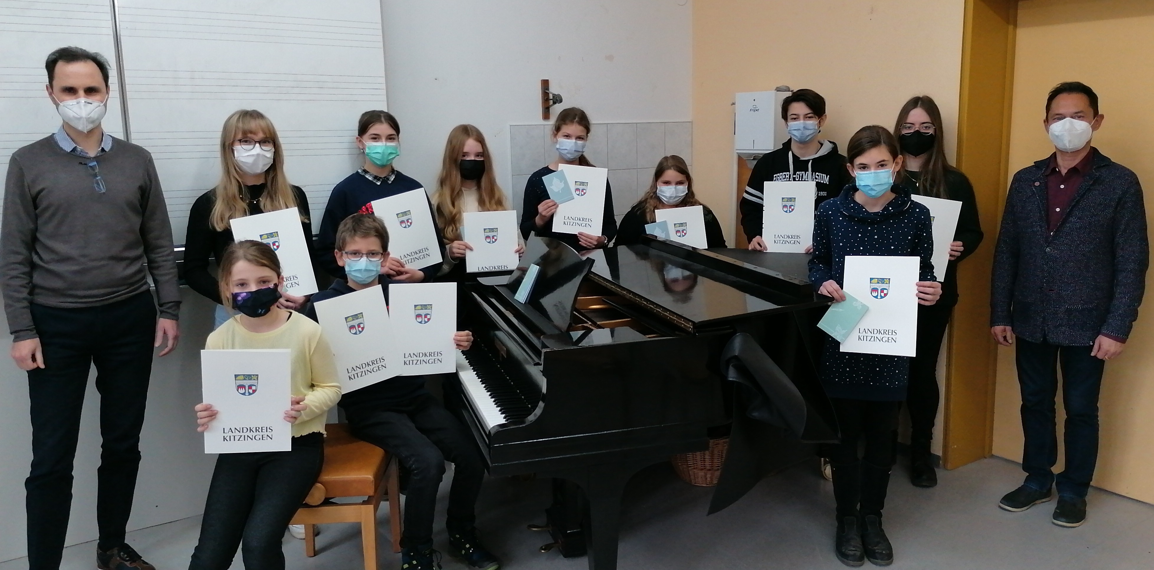 Münsterschwarzach/Kitzingen. Corona-bedingt in kleiner Runde wurden Schülerinnen und Schüler des Egbert-Gymnasiums für die erfolgreiche Teilnahme am Wettbewerb „Kunstpreis der Jugend“ (Musik) in Kitzingen geehrt. Schulleiter Markus Binzenhöfer und Fachschaftsleiter Rupert Neugebauer sprachen den Teilnehmerinnen und Teilnehmern ihre höchste Anerkennung für die Einsatzbereitschaft und tollen Leistungen auch unter Corona-Bedingungen aus. Viele von ihnen besuchen den Musischen Zweig am Egbert-Gymnasium und lernen ihr Instrument an der Musikschule, die dem EGM angeschlossen ist. Beeindruckend war die Bandbreite der Instrumente, auf denen die Schüler ihre Erfolge erzielten. Neben Blasinstrumenten wie Querflöte, Klarinette, Oboe und Trompete zeigten einige auch ihr Können auf dem Klavier. Zwei Schülerinnen absolvierten das praktische Wertungsspiel auf der Harfe. Herausragend war die Leistung von Leopold Rümmele an der Violine.