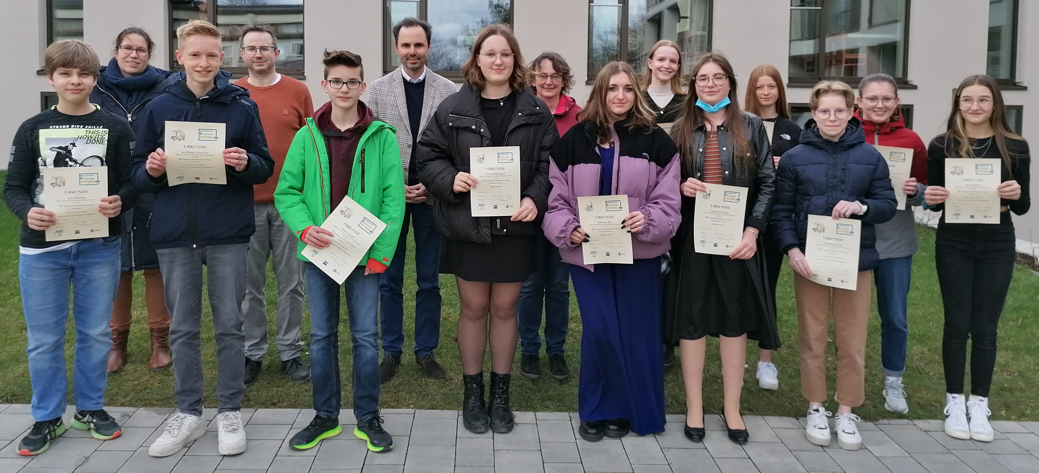 Stolz präsentieren sich die Teilnehmer des MNU-Wettbwerbs. Interessante Aufgaben brachten den Schülerinnen und Schülern einen ersten und mehrere zweite Plätze ein. Experimentelle Fragestellungen in der Juniorstufe rund um das Leuchtverhalten von Lämpchen, das Spektrum der Sonne und um das Temperaturverhalten von Rasierschaum wurden erfolgreich bearbeitet. In der Fortgeschrittenenstufe ging es dann theoretischer zu: Widerstände und Spannungen an Weihnachtslichterketten, Schattenlängen bei einer Heißluftballonfahrt in den Sonnenuntergang mussten berechnet werden und ein Experiment zur Schwingungsdauer eines mit Kugeln gefüllten Reagenzglases in Wasser durchgeführt und dokumentiert werden.