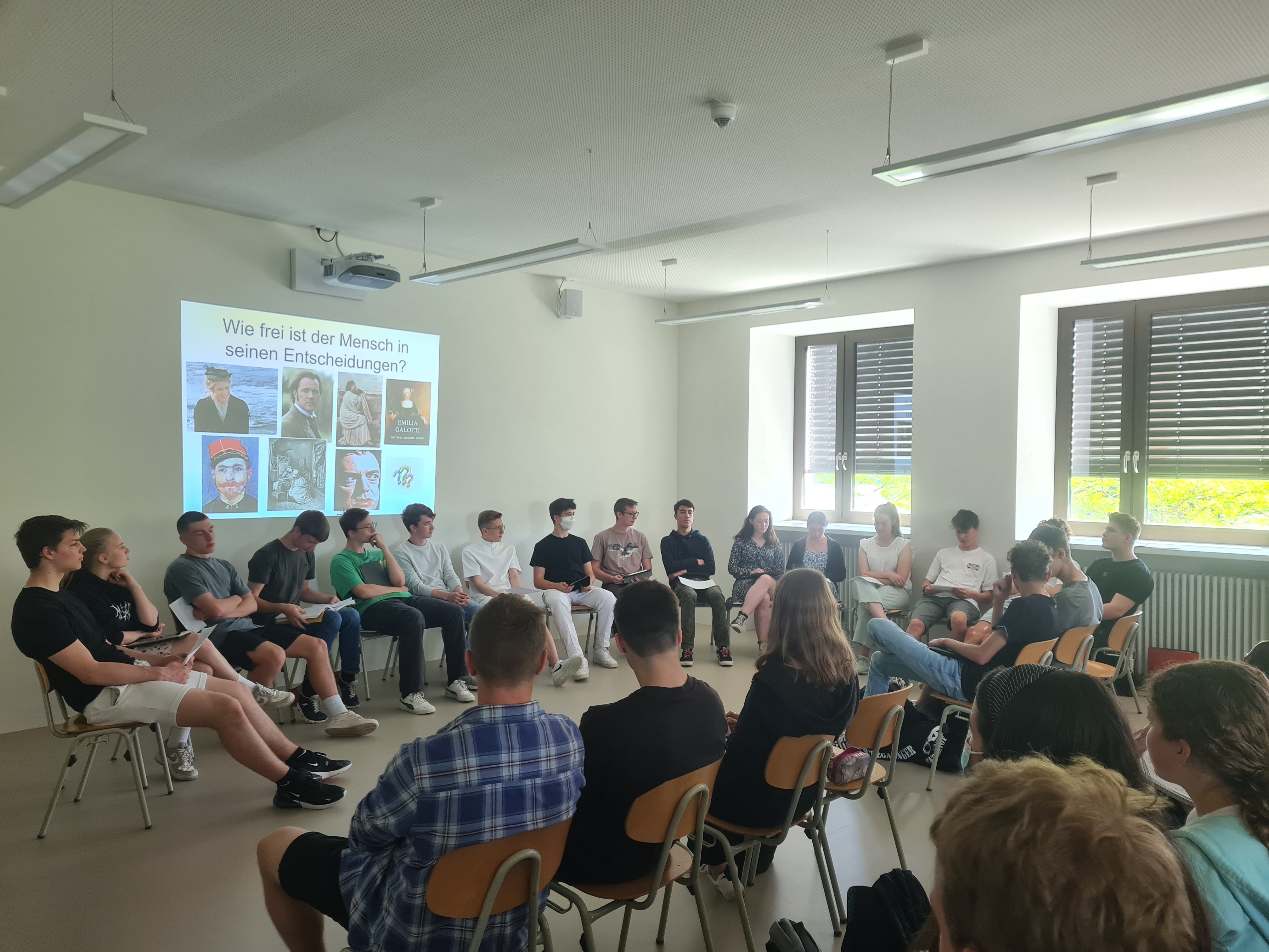 Abschließend wurde die Diskussionsfrage in die aktuelle Zeit geholt und die SchülerInnen erläuterten, welche Konflikte sie austragen und welche äußeren Faktoren dabei ihr Handeln bedingen. In diesem Kontext wurde beispielsweise der Spagat zwischen Freizeit und Lernzeit, aber auch die Berufswahl (folge ich hier meiner Passion oder materiellen Bedürfnissen?) angesprochen. Die Schülerin Paula P. schlussfolgerte, dass die Gesellschaft aufgrund sich wandelnder Normen und Werte in einigen Aspekten einen wesentlich geringeren Einfluss auf das menschliche Handeln habe. Insgesamt müsse der gesellschaftliche Druck in bestimmten Bereichen jedoch noch massiv zurückgehen, damit der Mensch noch freier in seinen Entscheidungen werden könne.