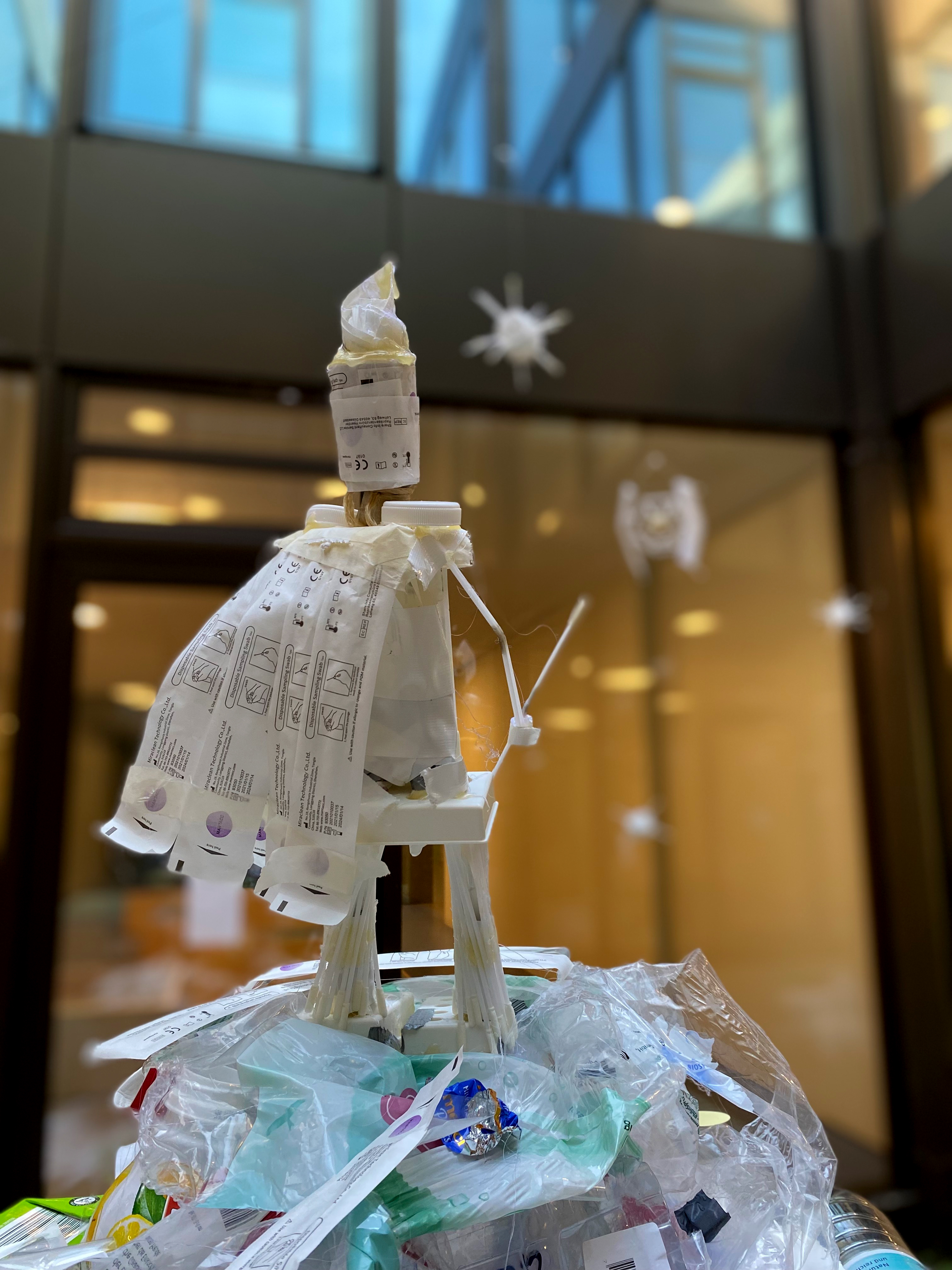 Aufgrund des aus den Massentestungen entstandenen großen Menge an Müll, hat die Q11/12 am Egbert-Gymnasium Objekte zum Thema Corona und Müll entwickelt, die aus übrig gebliebenen Teststäbchen, deren Verpackung und Flüssigkeitshalterungen, sowie Cellophanhüllen gebastelt wurden.