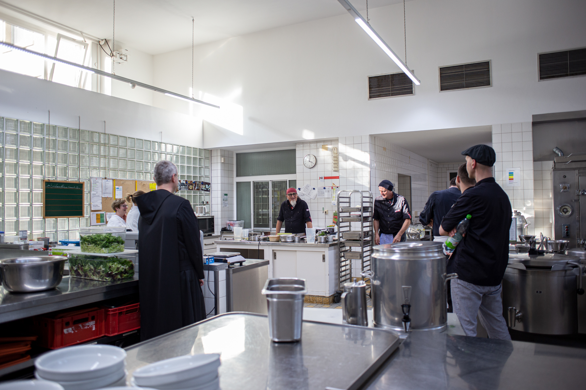 Der Donnerstag begann für den Neigungskurs Kochen am EGM um 8 Uhr also in der Klosterküche. Das Ziel: Mittagessen für das gesamte Kloster mit seinen Betrieben kochen – inklusive der Schule. Nach der Aufteilung in einzelne Kochteams, die jeweils Unterstützung aus der Klosterküche hatten, wurde Gemüse und Fleisch geschnitten, Kräuter geputzt und Spätzleteig gerührt. „Ganz schön viel los heute“, meinte Küchenleitung Anne Stöcklein, die immer wieder zwischen den einzelnen Stationen koordinierte. Sie leitet auch den Neigungskurs, der im vergangenen Schuljahr eingeführt wurde.