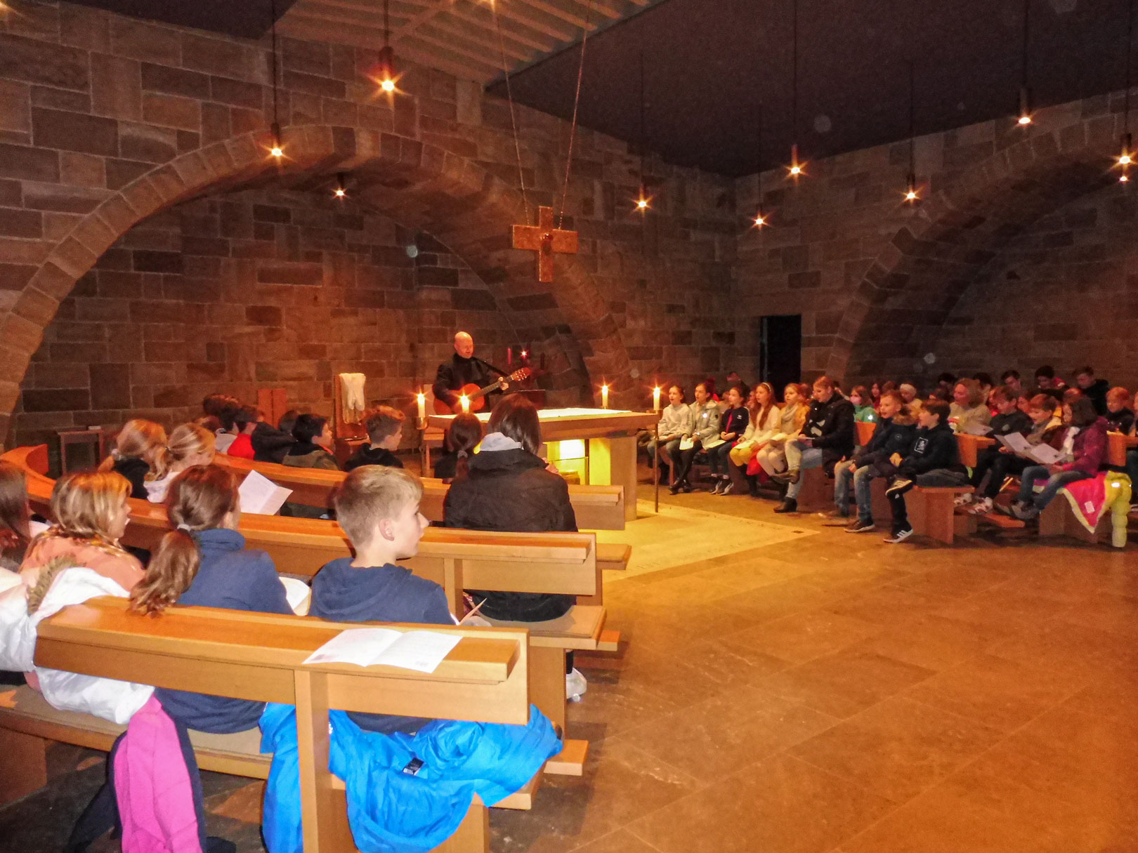 Zum Foto: Das Team des Tagesheims und die Schulseelsorge, hier Br. Melchior an der Gitarre, hatten die Nikolausfeier vorbereitet. Foto Bühler