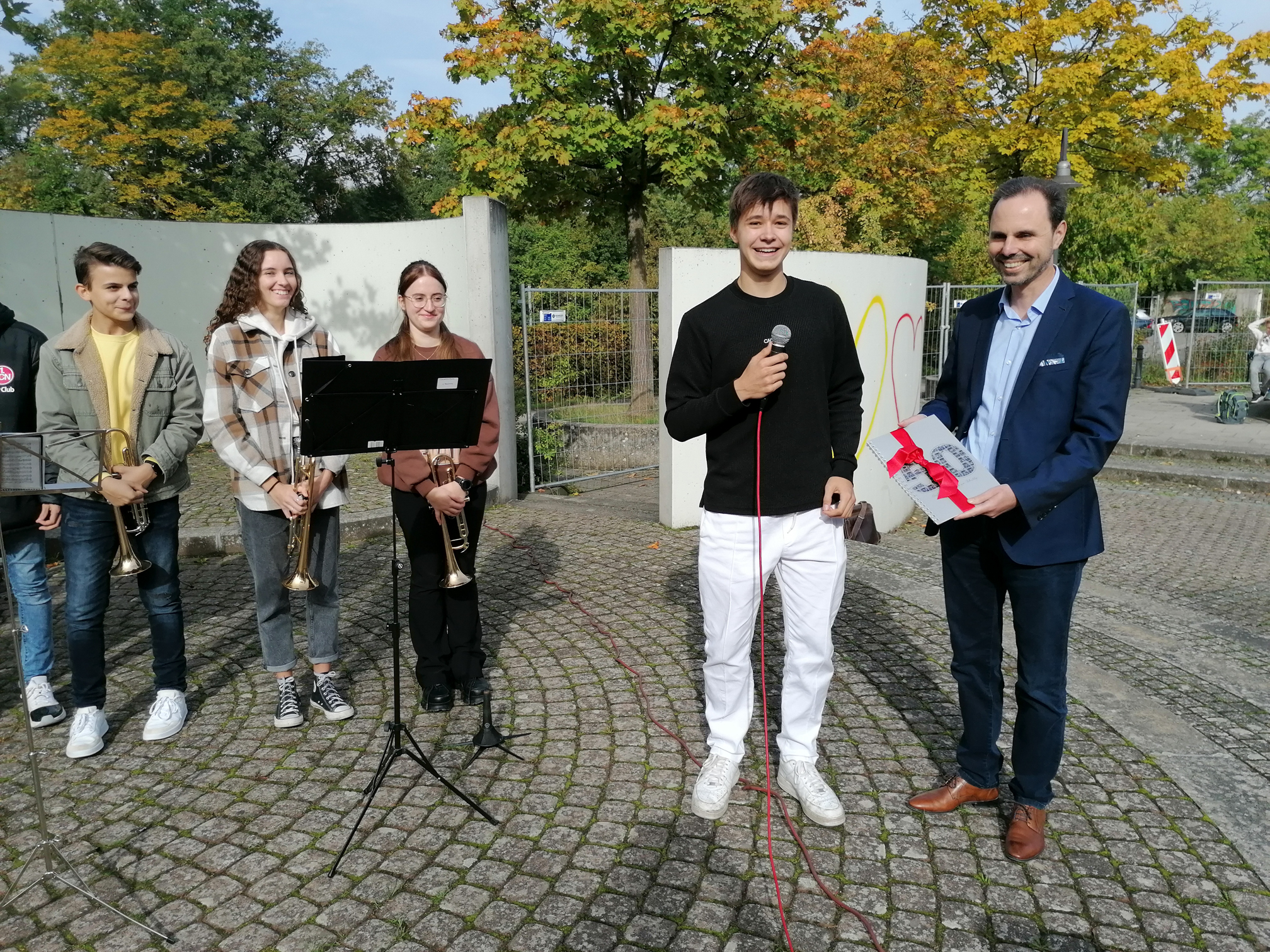 Unser Schulleiter Markus Binzenhöfer feierte seinen 50. Geburtstag und die Schulfamilie gratulierte herzlich auf dem Pausenhof.